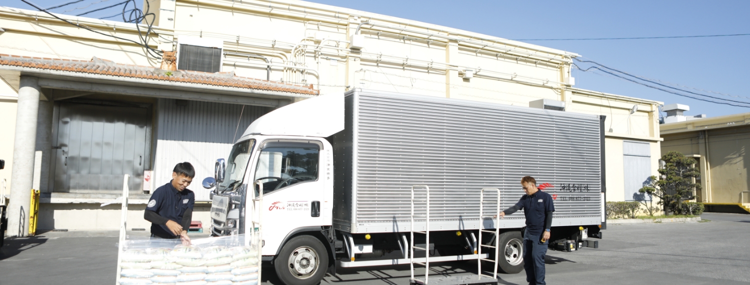 グループ会社沖縄食糧にて精米する原料玄米の一貫輸送に取り組んでおります。沖食商事では陸上輸送や海上輸送を行う為の車両や船舶の手配を行い、お客様に最適な流通経路のご提案を目指します。